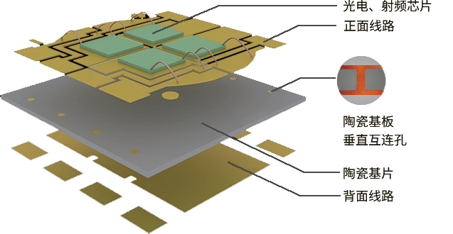 薄膜電路陶瓷封裝基板是一種通過磁控濺射薄膜金屬化與電鍍制程的技術(shù):即根據(jù)應(yīng)用需要,在高導(dǎo)熱的陶瓷基體上,采用薄膜金屬化及影像轉(zhuǎn)移方式制作2D金屬線路,然后采用TCV(Through Ceramic Via) 技術(shù)形成雙面布線間的垂直互連,最后采用堆疊技術(shù)獲得與陶瓷基體結(jié)合緊密的一體式3D金屬框架。基于薄膜電路工藝,通過磁控濺射實現(xiàn)陶瓷表面金屬化,通過電鍍實現(xiàn)銅層和金成的厚度大于10微米以上即DPC(DirectPlateCopper-直接鍍銅基板)。
